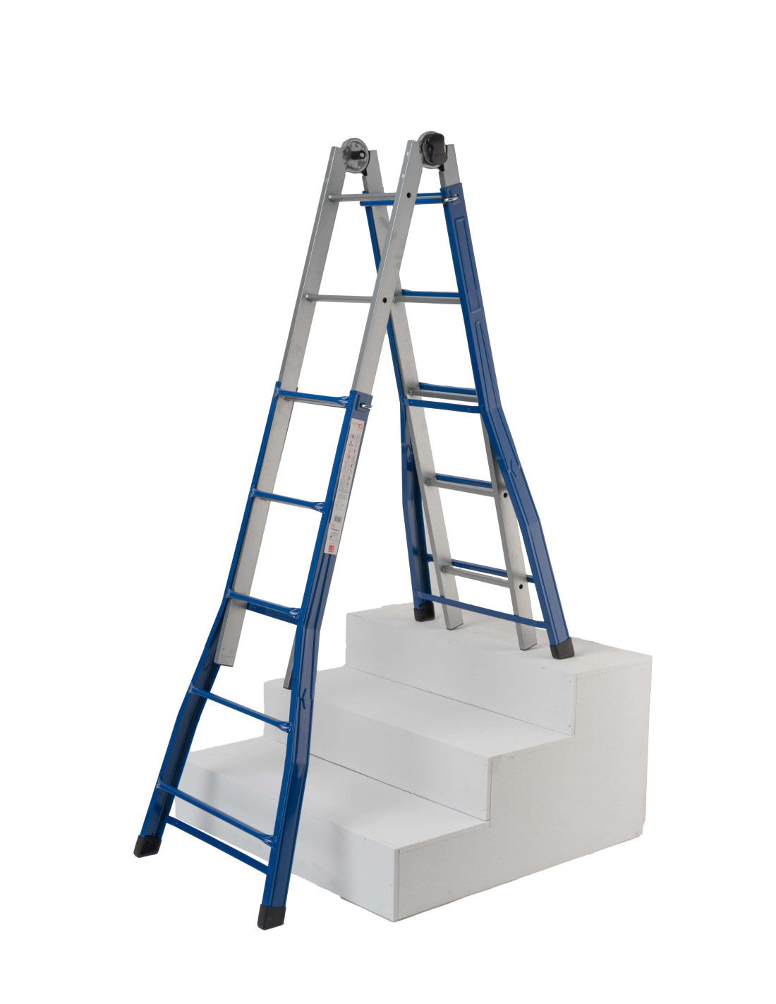 La scala multifunzione telescopica, è tutta in acciaio e si può usare: come scala doppia (o a portafoglio); tutta estesa (in appoggio); zoppa, per superare un dislivello.